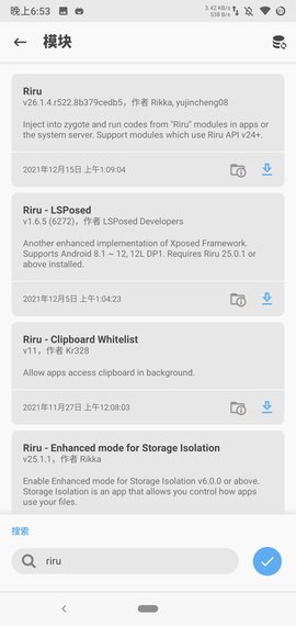 选择搜索,并输入“riru",选择安装“Riru”与“Riru - LSPosed”,接着重启手机