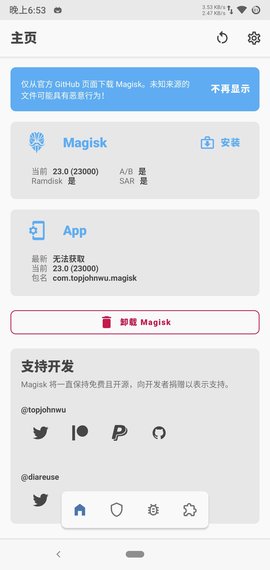 首先安装Magisk App(Magisk通过挂载一个与系统文件相隔离的文件系统来加载自定义内容)