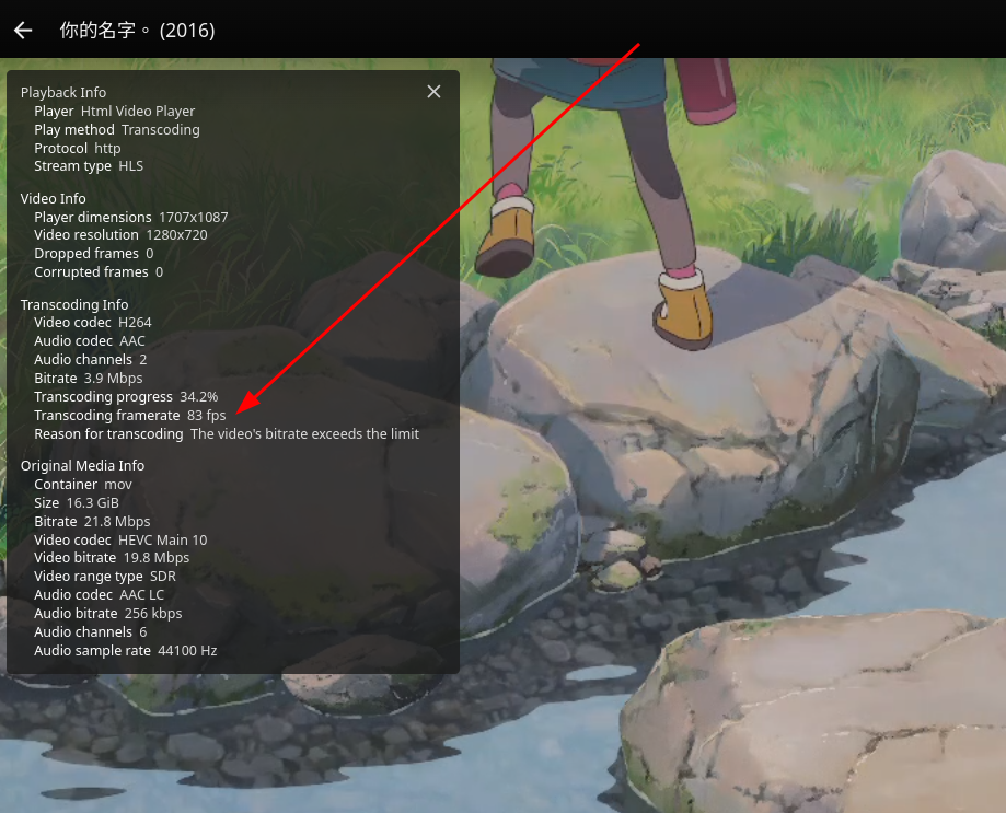 找一部 HEVC 的片播放并查看转码信息: