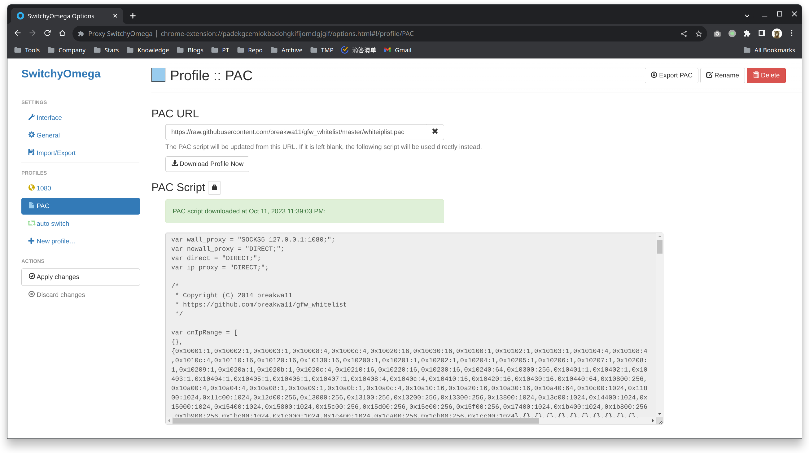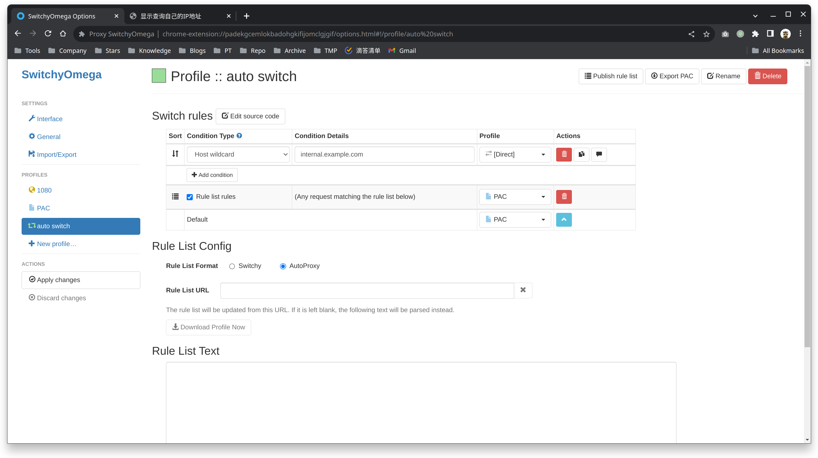 PAC 模式 (Proxy Auto-Config): PAC 是 Proxy Auto-Config 的缩写,这是一种网络技术,它允许你使用一个 JavaScript 文件来定义哪些网址应该使用代理,哪些则不应该,SwitchyOmega 的 PAC 模式就是使用这种技术