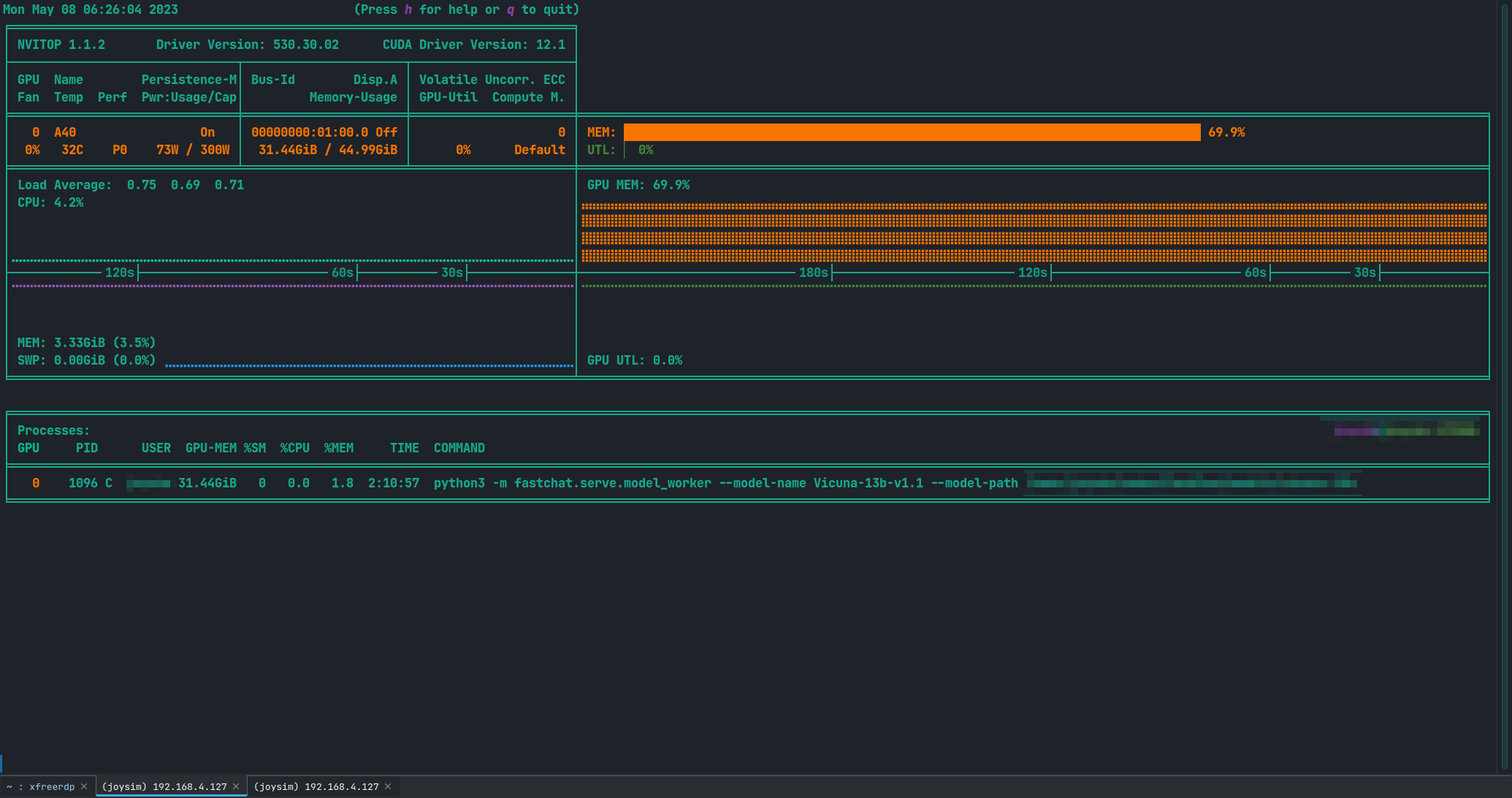 使用方法非常简单,可以在上述的Vicuna-13b虚拟环境中安装nvitop